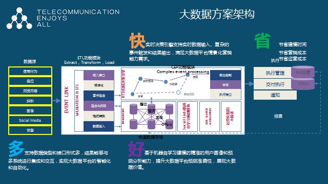 广泛的南向接口能够适配各种数据类型大数据,支持实时大数据的处理,为用户提供实时营销的能力,在用户最需要、最合适的时机提供营销行为。北向可以与营销系统进行对接,实时推送预测结果,支持营销结果评估,交付通知和报表。