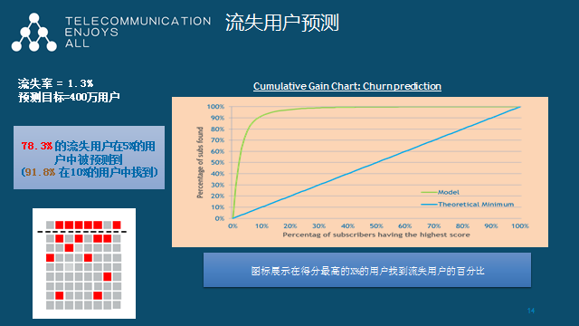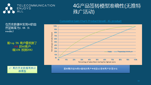 对于某运营商的4G用户签转进行预测营销,Top5%的用户里找到了14%的4G用户,是自然签转率的10倍。